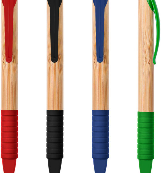 bolígrafo lucky cuerpo color madera. pulsador, clip y punta plástico de color, grip de goma a juego. tinta negra.