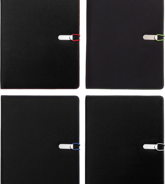 Folder, carpeta de microfibra con block de hojas blanca. cierre con banda elástica. 3 presillas para bolígrafos. folder interno. Compartimentos internos para tarjetas.